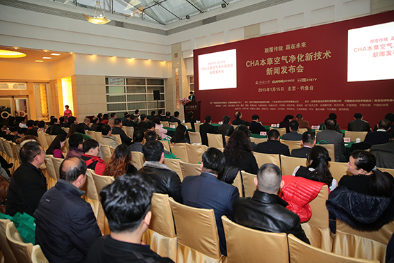 2015年元月15日,嚴冬的北京,霧霾彌漫,陣陣寒意,北京釣魚臺國賓館俱樂部陽光大廳里卻暖意濃濃,氣氛熱烈,下午三點,“CHA本草空氣凈化技術新聞發布會”在歡聲笑語中開幕。來自衛生、環保、工商、社保、金融、文化等多個部門的領導和全國各地空氣凈化行業的嘉賓,以及北京30多家媒體記者120余人齊聚一堂,共同見證CHA本草空氣凈化技術的誕生。